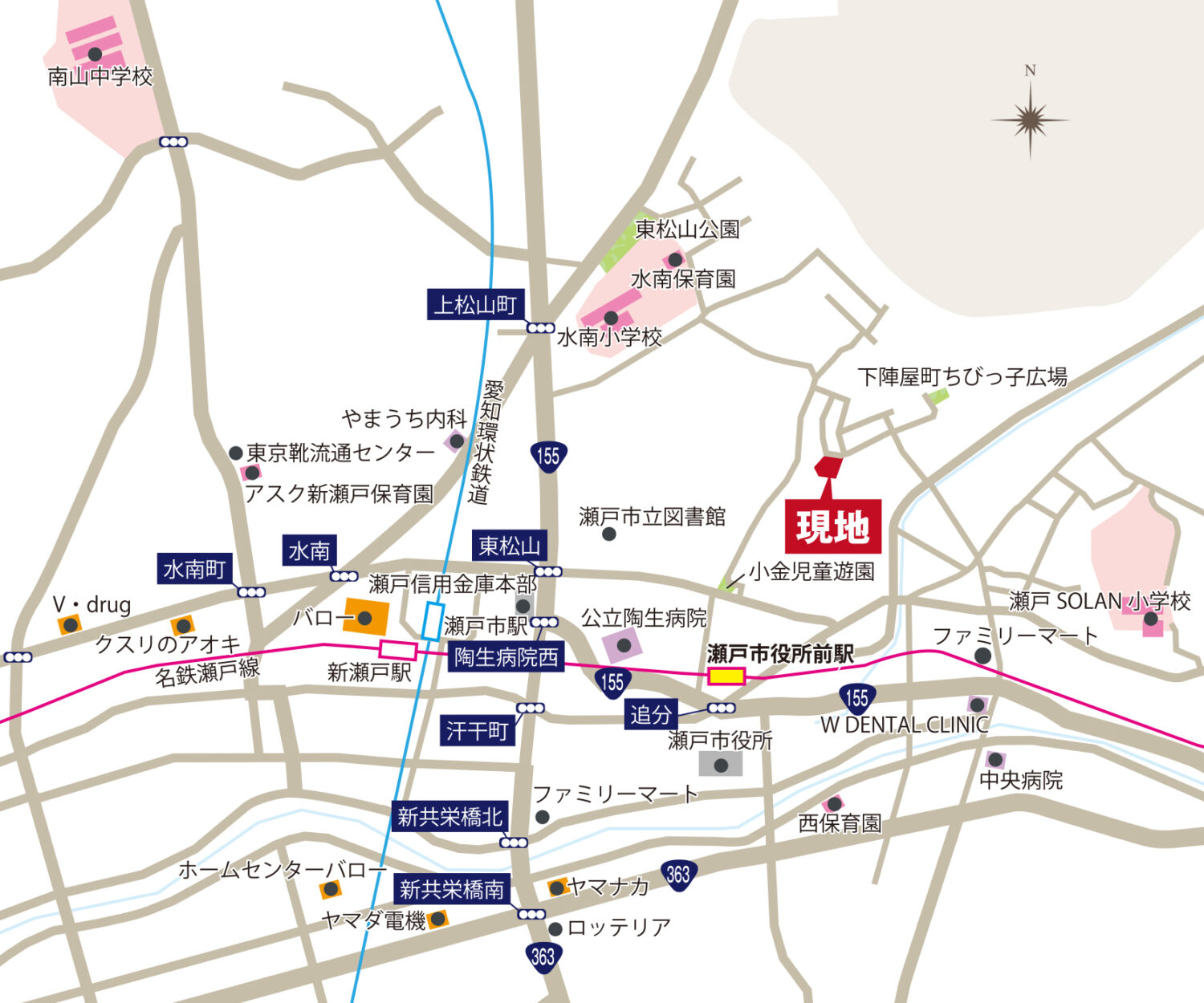 | 名鉄瀬戸線「新瀬戸」駅 | 約1,300m(徒歩17分) | |